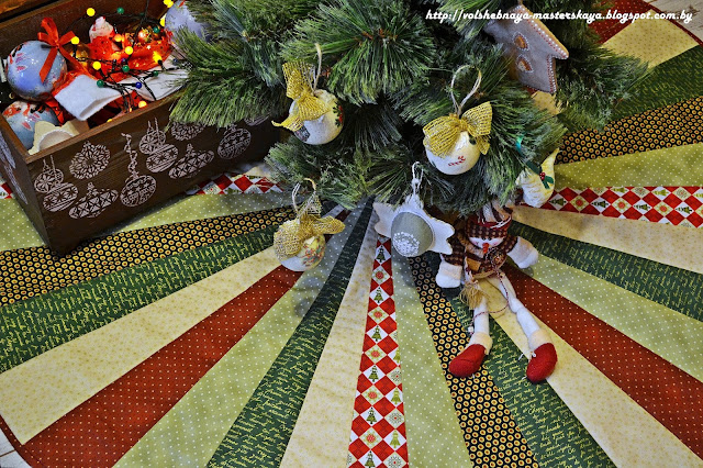 И ещё одна юбочка для ёлки "Новогоднее кружево".Размер такой же (диаметр 120см). Только в отличие от предыдущей версии - завязки из хлопчатобумажного широкого кружева. С обратной стороны - белорусский лен.